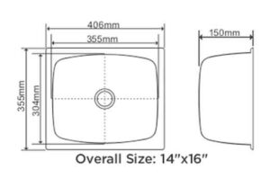 Overall Sink Size: 14″x16″ | 355×406 mm Sink Bowl Size: 12″x14x6″ | 304x355x150 mm Steel Grade: 202 Thickness: 0.7mm
